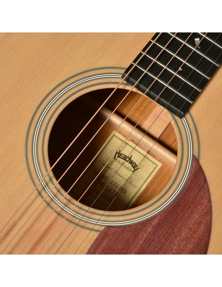 The combination of Sitka spruce and Japanese cherry gives this guitar a unique tone: round, deep basses, warm mids and crystal-clear highs. Ideal for fingerpicking and arpeggio players.