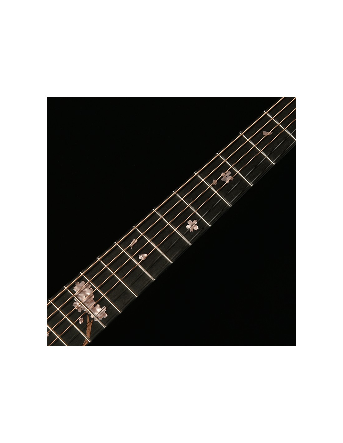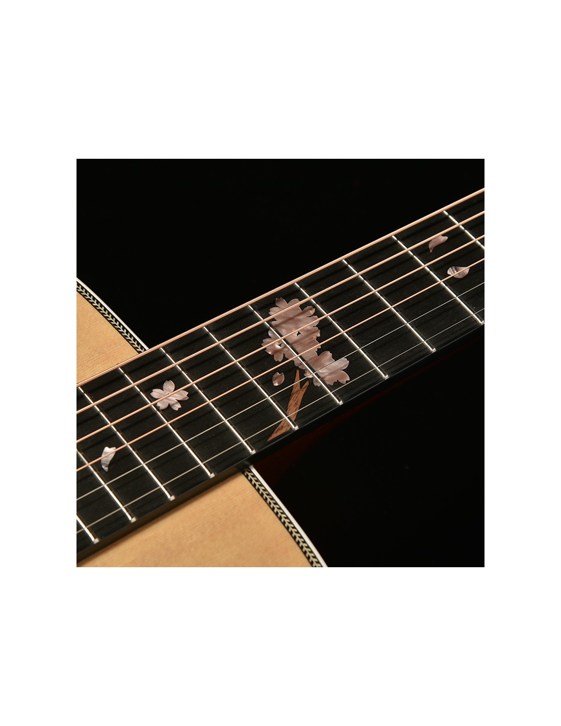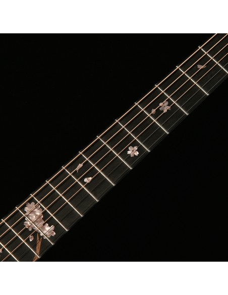 Exclusive inlays: Swallows and cherry blossoms in mother-of-pearl, a tribute to luthier Yasuo Momose.