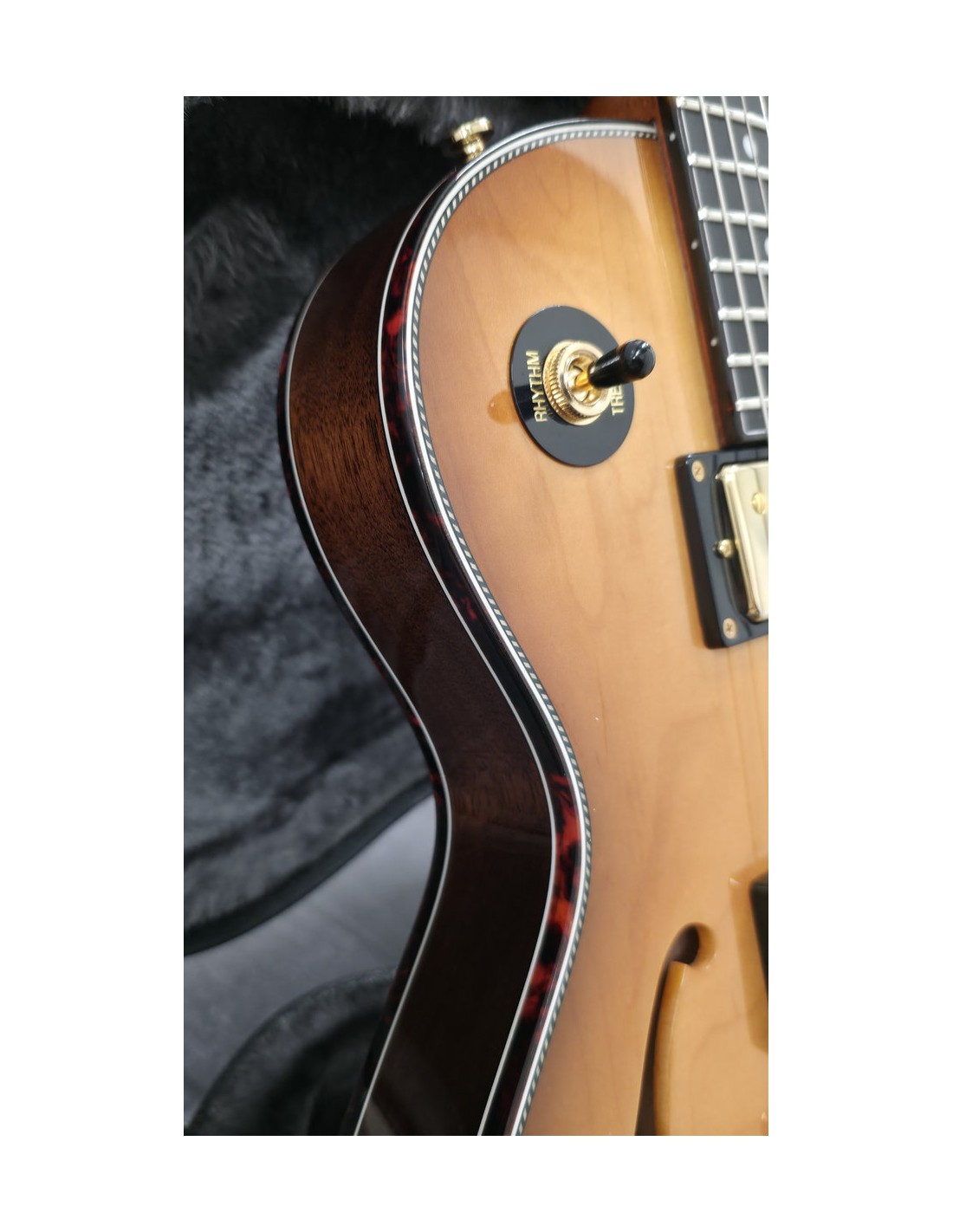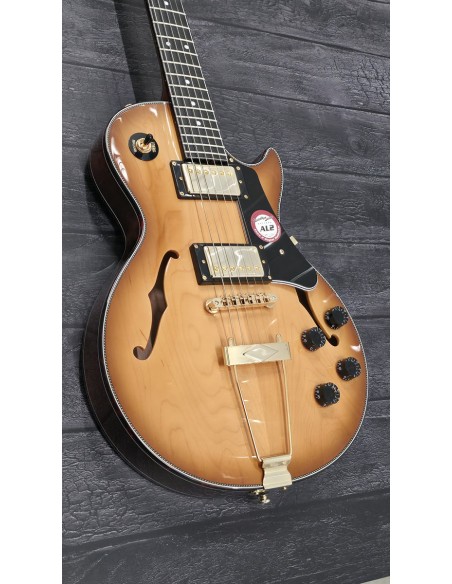 Its chambered semi-hollow construction combines a center block with deep internal chambers, delivering both the punch of an electric guitar and the natural resonance of a hollow instrument.
